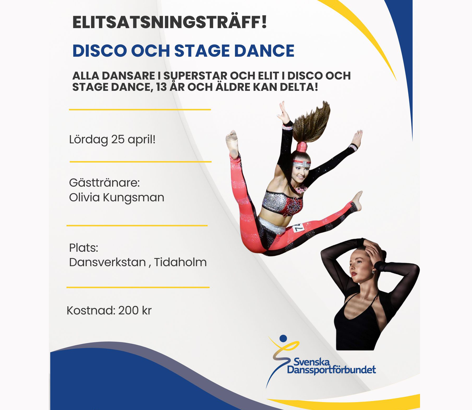 Dansare i nivåerna Superstar och Elit inom disco och stage dance, 13 år och äldre, bjuds in till en elitsatsningsträff på Dansverkstan i Tidaholm lördag 25 april. Träffen blir en gemensam uppladdning… -